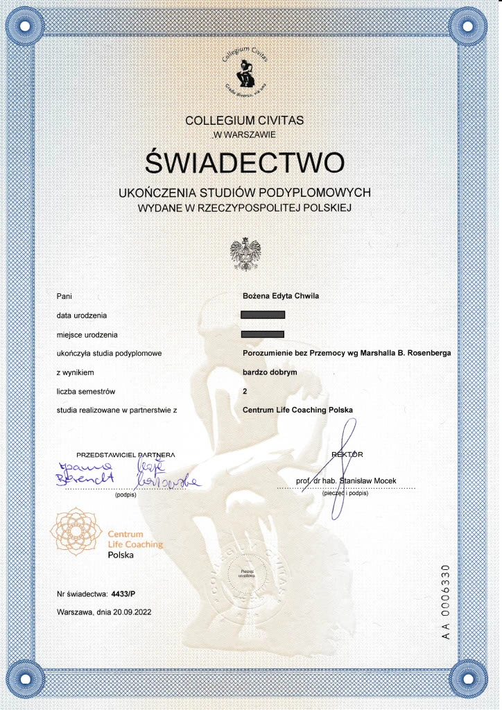 W mojej pracy łączę podejście skoncentrowane na rozwiązaniach, Porozumienie bez Przemocy według Marshalla Rosenberga oraz wiedzę płynącą z Teorii Poliwagalnej. Tworzę przestrzeń, w której możesz bez pośpiechu przyjrzeć się swoim emocjom, relacjom i potrzebom – z empatią, uważnością i szacunkiem.