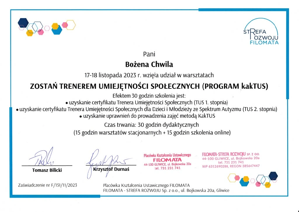W swojej pracy korzystam z treningu umiejętności społecznych (TUS) oraz metody Kids’ Skills, które pomagają dzieciom rozwijać ważne kompetencje emocjonalne i społeczne. Uczymy się rozpoznawania emocji, proszenia o pomoc, wyrażania swoich potrzeb, budowania pewności siebie i radzenia sobie w trudnych sytuacjach – często poprzez zabawę, ruch i rozmowę.